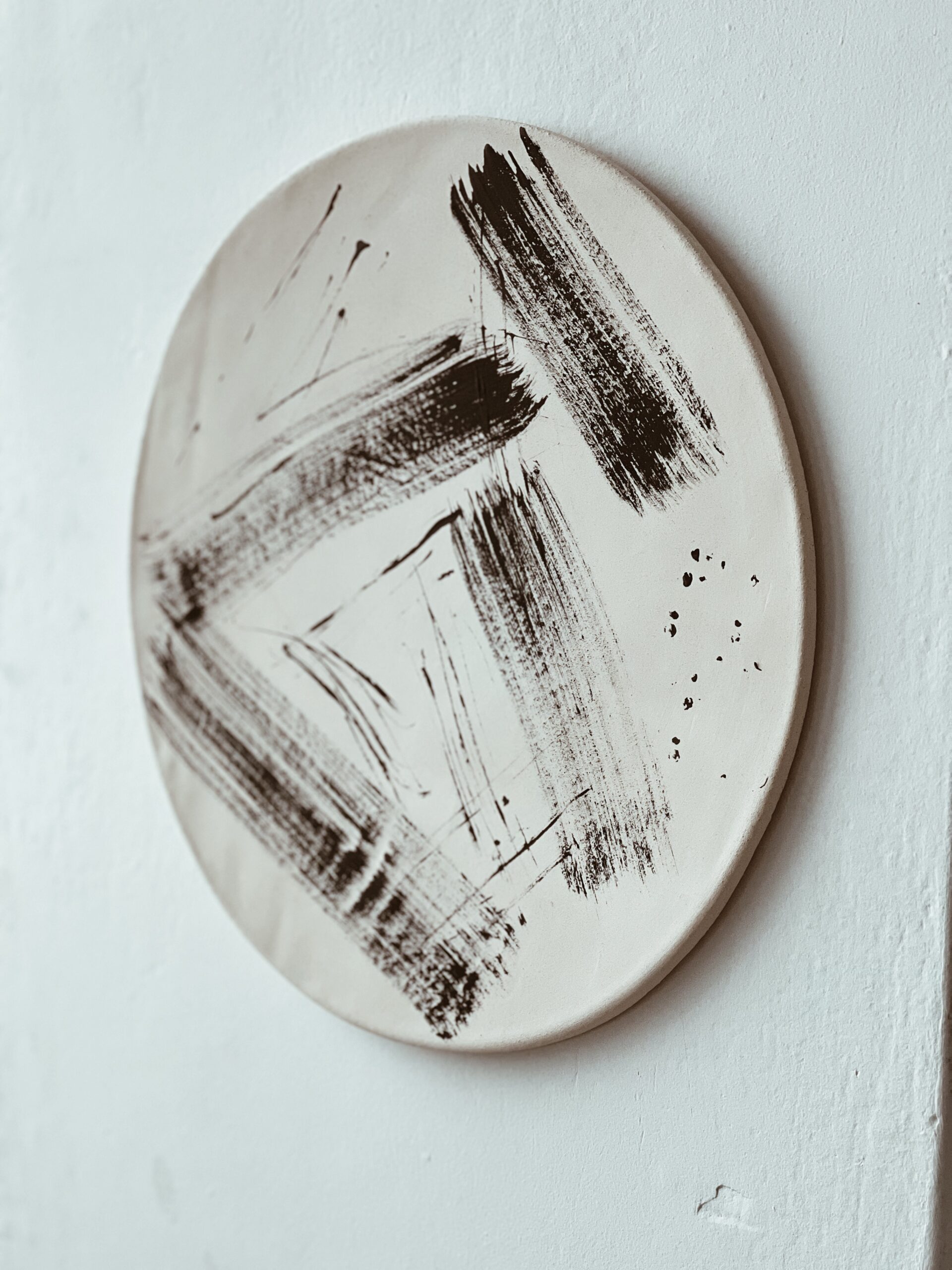 Surowa biała ceramika, dekorowana czarną matową angobą.
